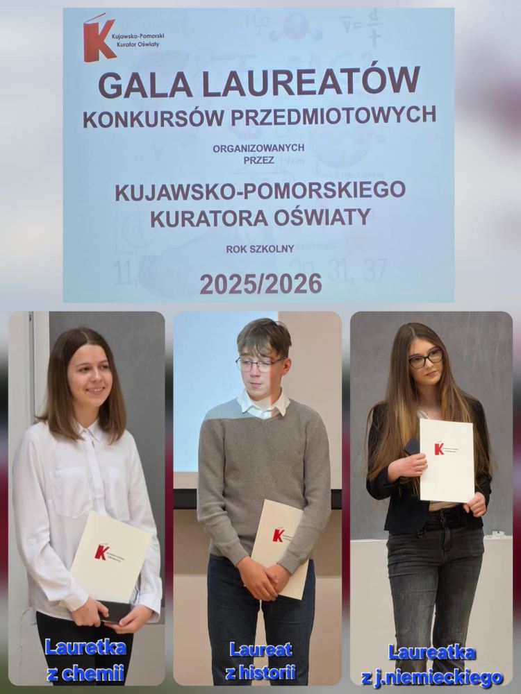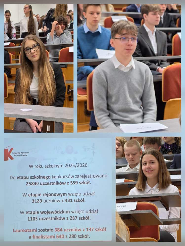 Dnia 20 kwietnia 2026r. w Auditorium Novum Politechniki Bydgoskiej laureaci konkursów przedmiotowych odebrali swoje nagrody. Podczas uroczystej gali Michał Koniuch, wicewojewoda kujawsko-pomorski, oraz Grażyna Dziedzic, kujawsko-pomorska kurator oświaty, wręczyli uczniom m.in. zaświadczenia dla laureatów oraz upominki. Nie zabrakło także podziękowań dla opiekunów oraz wyróżnień dla dyrektorów szkół, które zdobyły największą liczbę tytułów laureata i finalisty w województwie kujawsko-pomorskim.