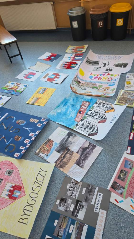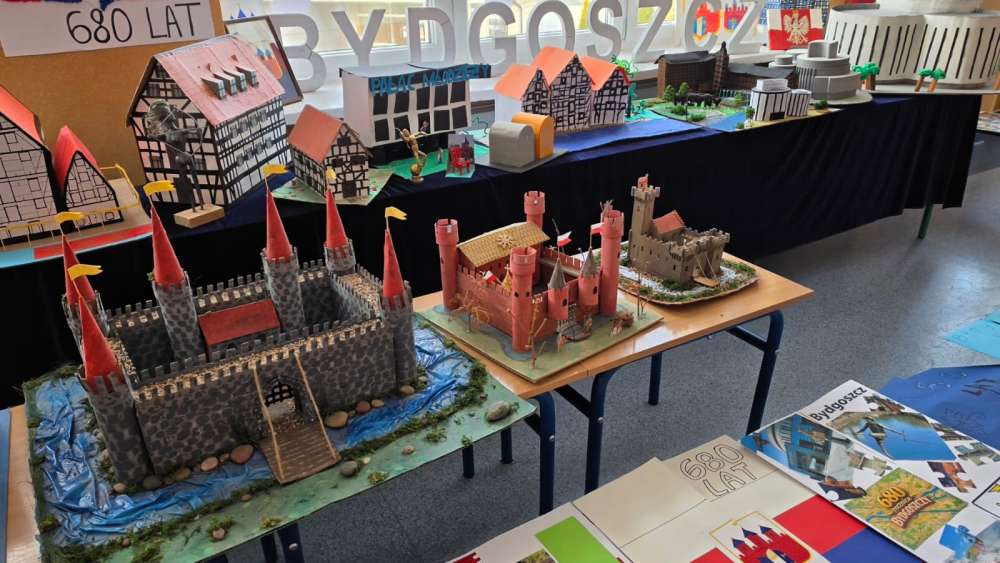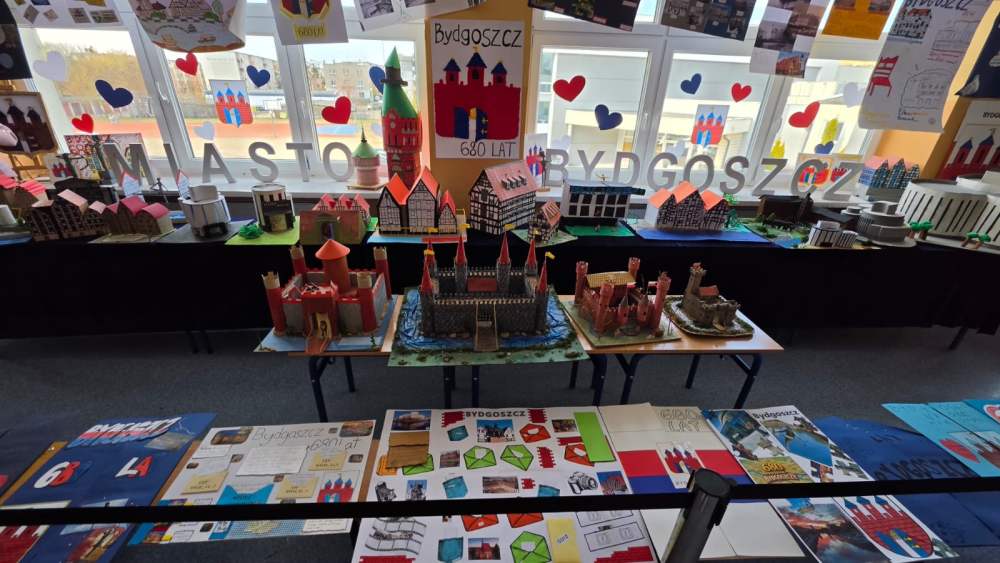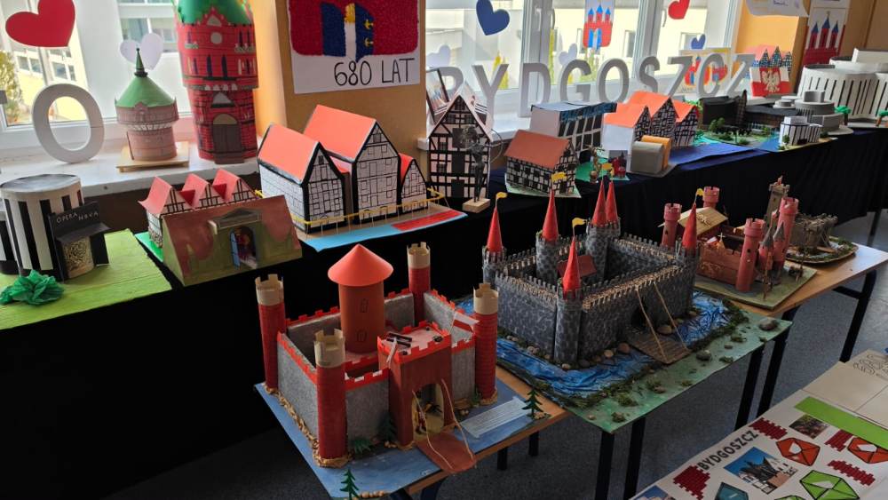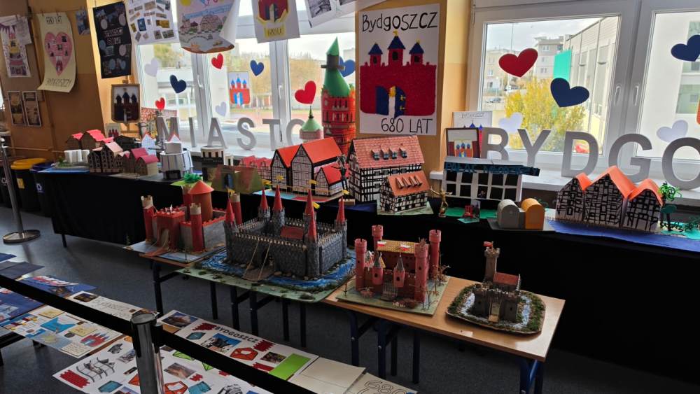 Drzwi sal lekcyjnych zostały pięknie udekorowane, a na szkolnych korytarzach zaprezentowano wystawę plakatów, lapbooków oraz projektów miniatur bydgoskich budowli i herbu miasta. Powstał również okolicznościowy tort, który w ciekawy sposób przedstawiał przebieg zaplanowanych obchodów.