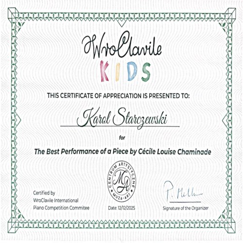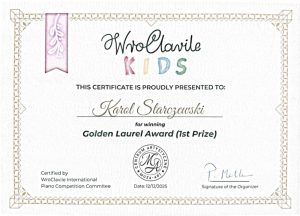 W listopadzie Karol pomyślnie przeszedł eliminacje do Międzynarodowego Konkursu Pianistycznego WroClavile – edycja jesienna Kids. Po zakwalifikowaniu się do etapu głównego zaprezentował swoje umiejętności w konkursie finałowym, przygotowując wymagany program artystyczny.