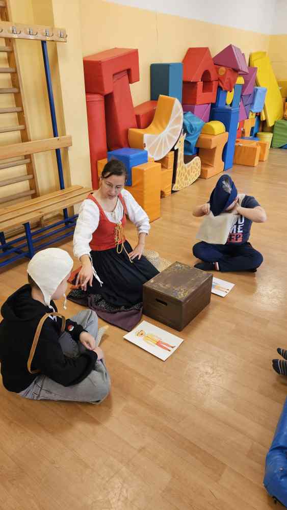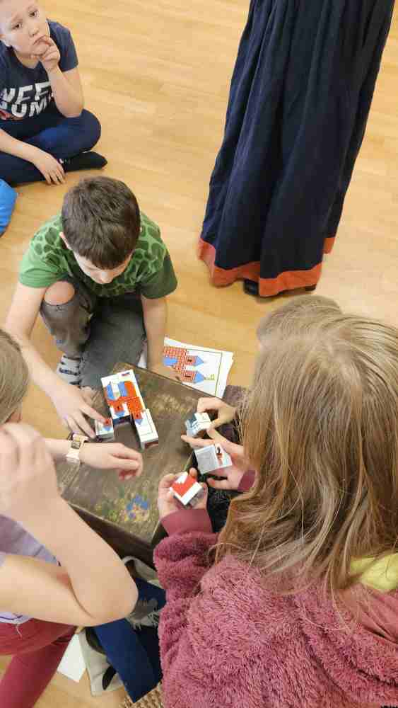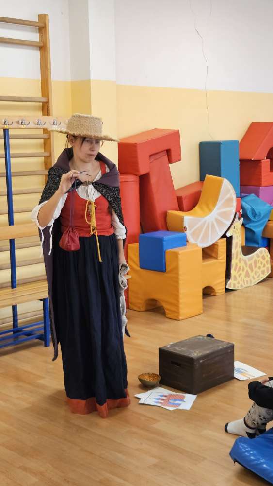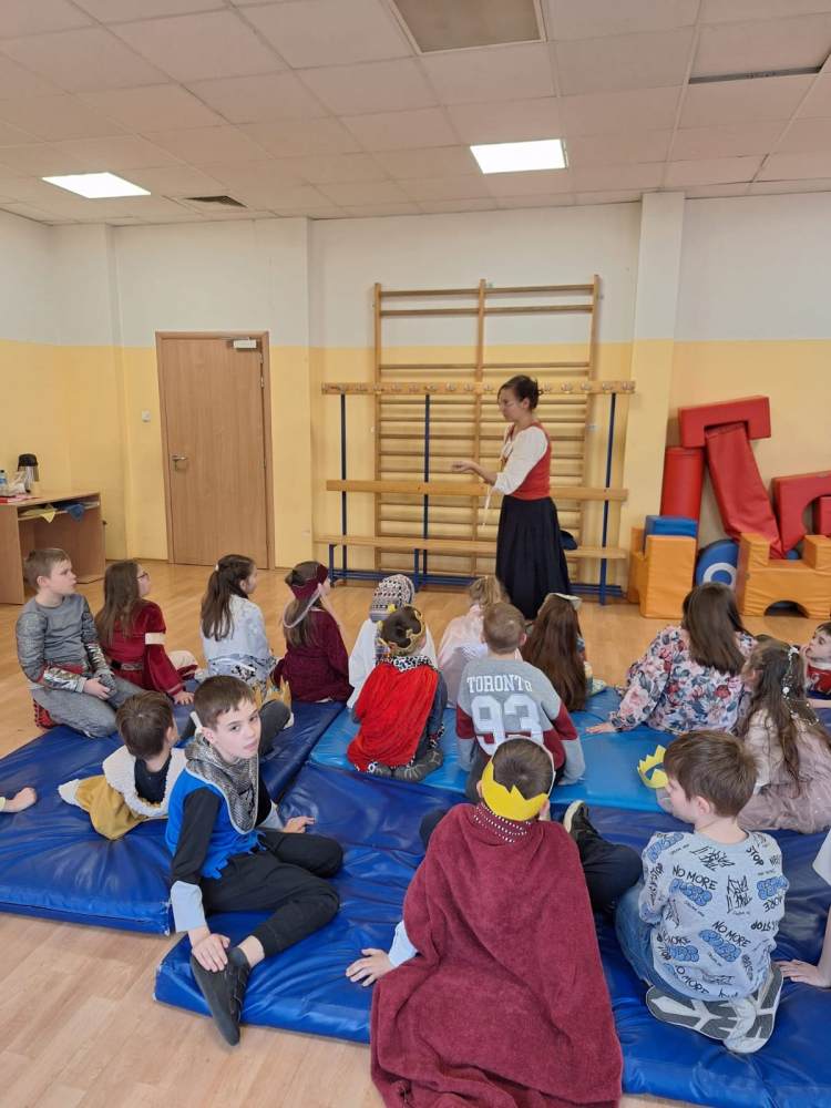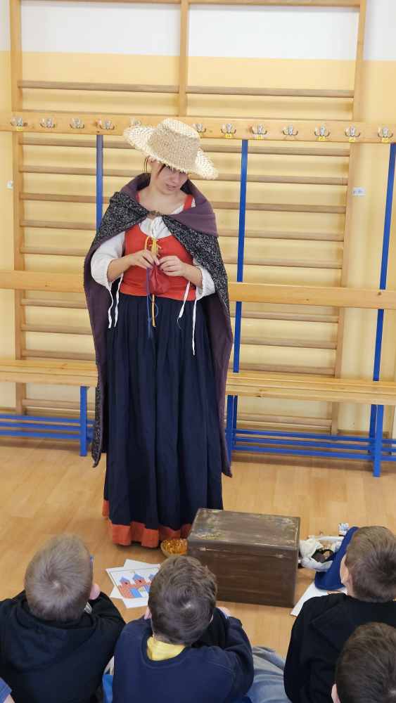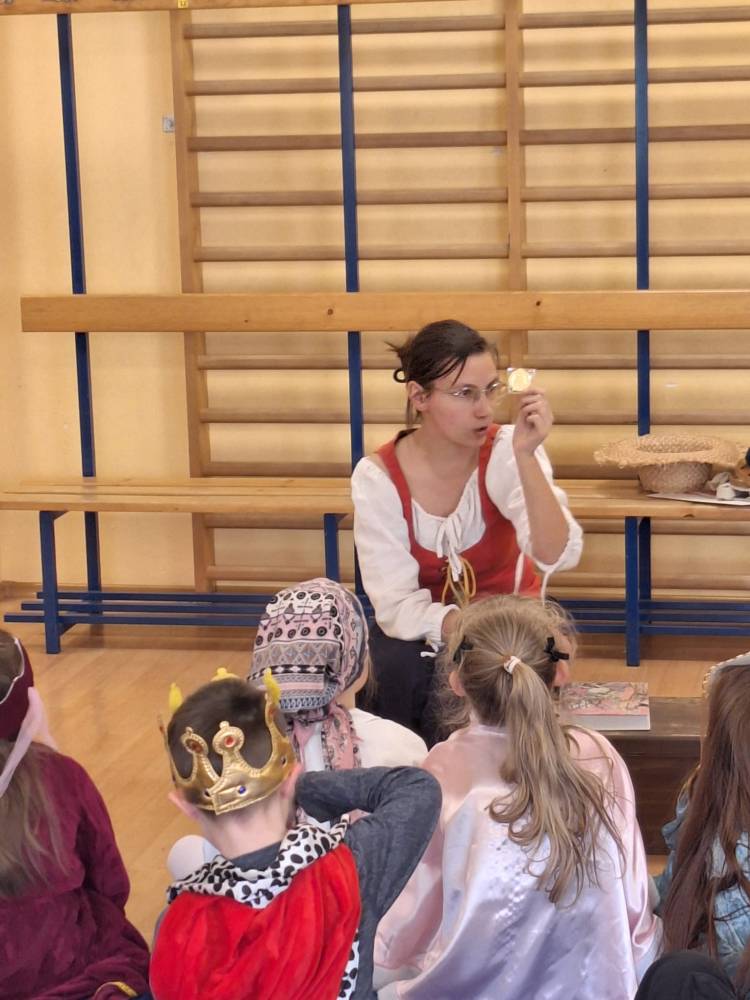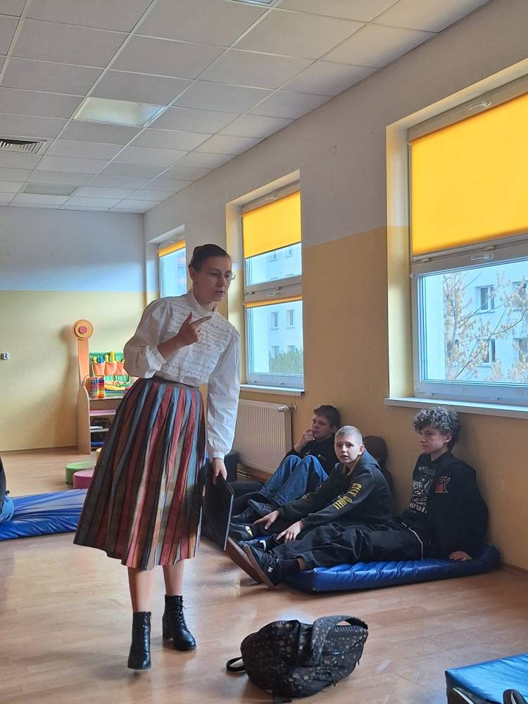 Prowadząca warsztaty Pani MARTA BUKOLT z PROJEKT ZABYTEK wcielała się w różne postacie, zakładając stroje nawiązujące do tematyki zajęć, co dodatkowo pobudzało wyobraźnię uczestników. Dzieci i młodzież miały okazję poznać najciekawsze legendy związane z Bydgoszczą, a także odkryć historię i ciekawostki dotyczące swojego „fyrtla”, czyli dzielnicy Błonie, w której znajduje się nasza szkoła.