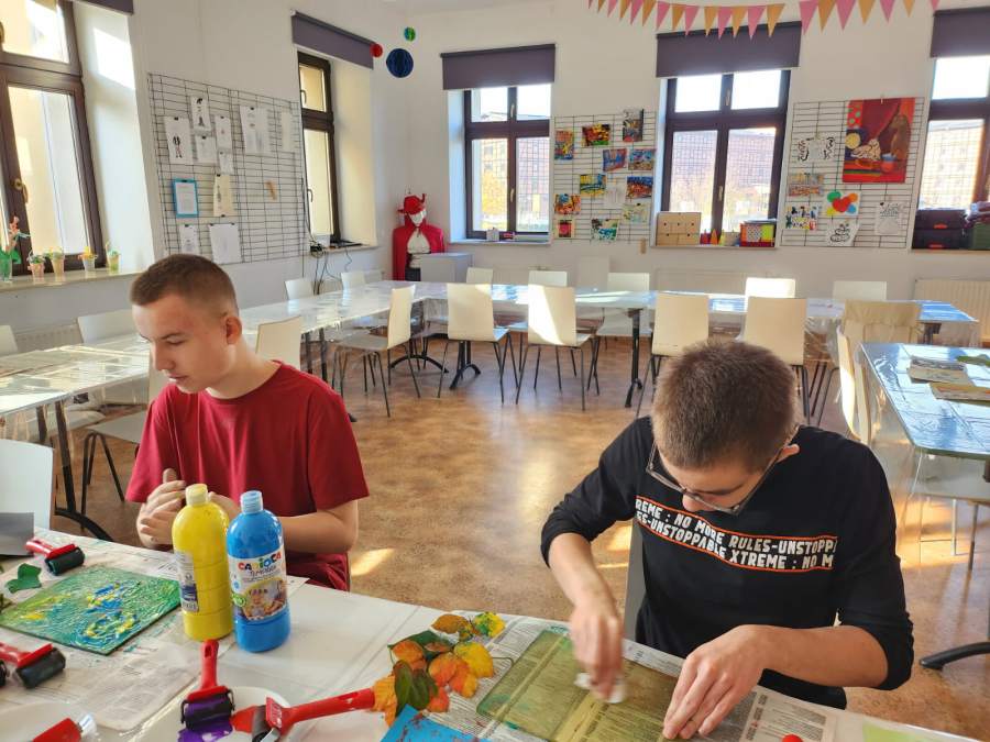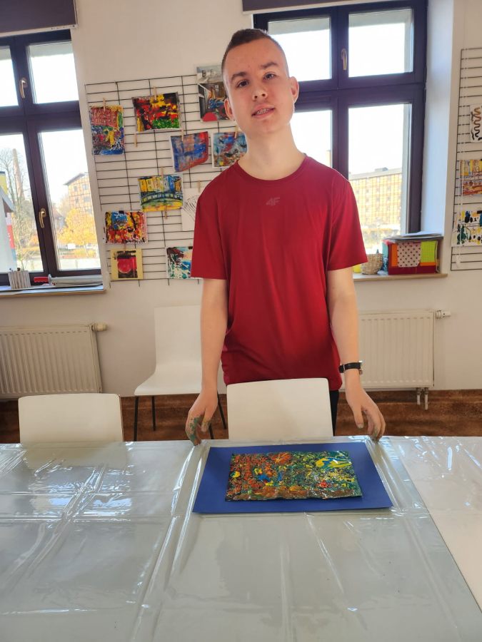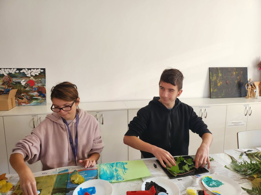 6.11.2025 klasy 7c i 8c uczestniczyły w warsztatach plastycznych w Muzeum Okręgowym im. Leona Wyczółkowskiego w Bydgoszczy. Zajęcia odbywały się w ramach Bydgoskiego Grantu Oświatowego dla Osób z Niepełnosprawnościami ”Serce Słyszy Serce”. Warsztaty przebiegały w formie praktycznej. Podczas zajęć uczestnicy poznali jedną z bardziej efektownych technik graficznych jaką jest Monotypia. Ta technika artystyczna pozwala na uzyskanie tylko jednej, unikalnej odbitki. Powstaje poprzez nałożenie farby na płaską powierzchnię, taką jak szkło, a następnie odbicie jej na papierze. Artyści – uczniowie klas 7c i 8c pokrywali gładką matrycę farbą, używając do tego wałka i pędzla. Na powierzchni farby tworzyli różnorodne kompozycje, nakładając lub usuwając farby, a także przykładając barwne liście, aby uzyskać ciekawe struktury. W ten sposób powstały przepiękne i oryginalne prace. Każda odbitka była niepowtarzalna, jedyna w swoim rodzaju. Uczniowie doskonale się przy tym bawili, integrowali i aktywnie spędzali czas. Wrócili do szkoły ze swymi ,,dziełami sztuki ”.